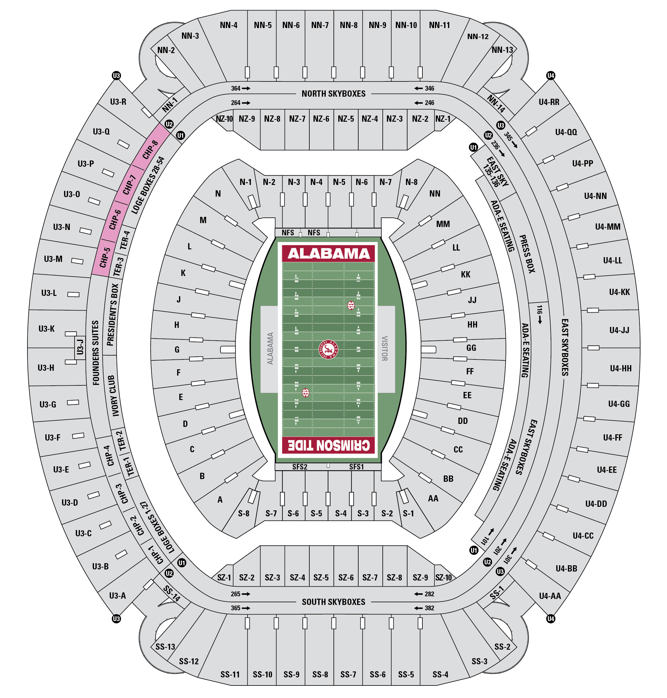 The North Champions Club is located on level 7 on Saban Field at Bryant-Denny Stadium's west side.