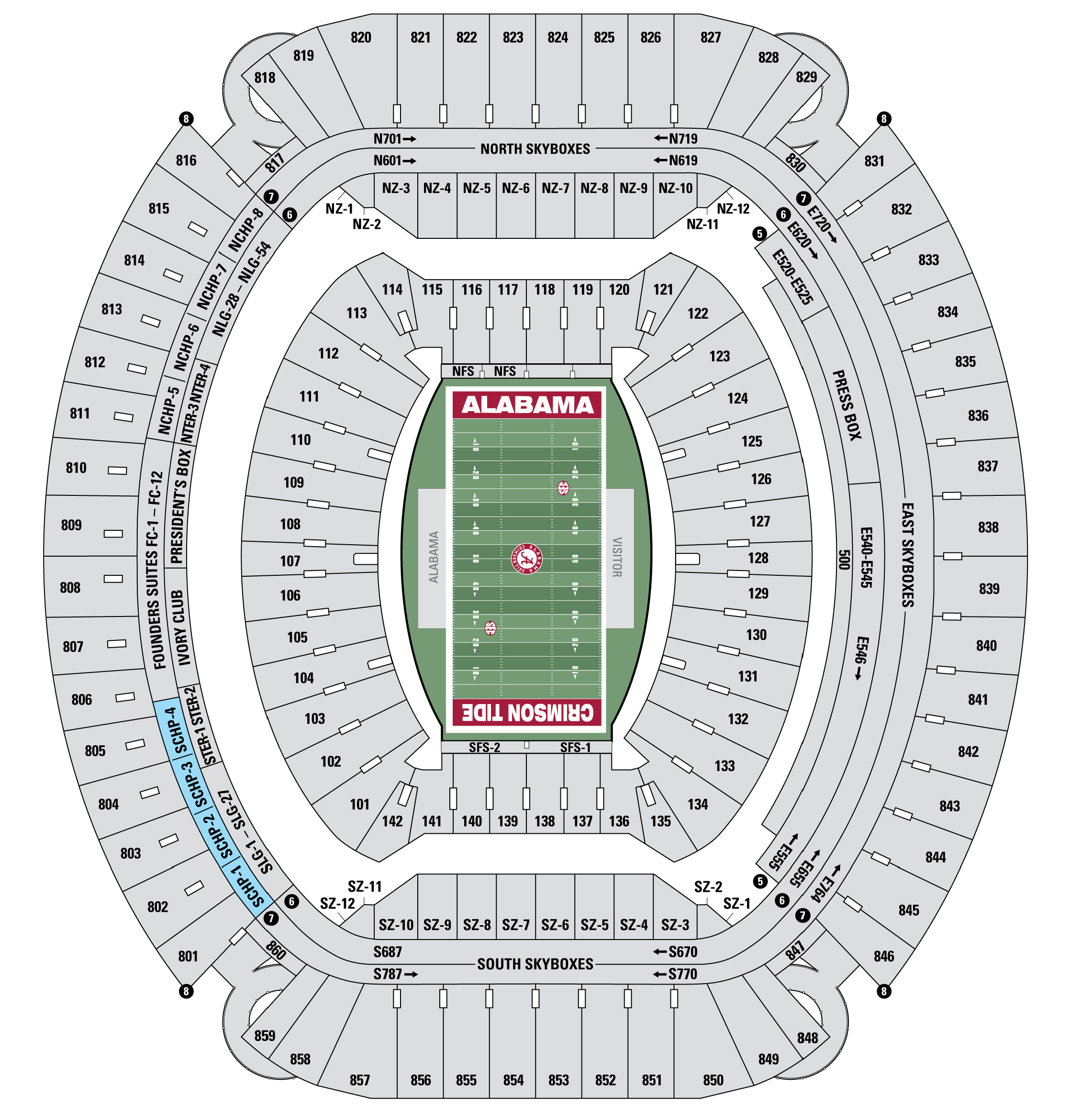 The South Champions Club is located on level 7 of Saban Field at Bryant-Denny Stadium's west side.