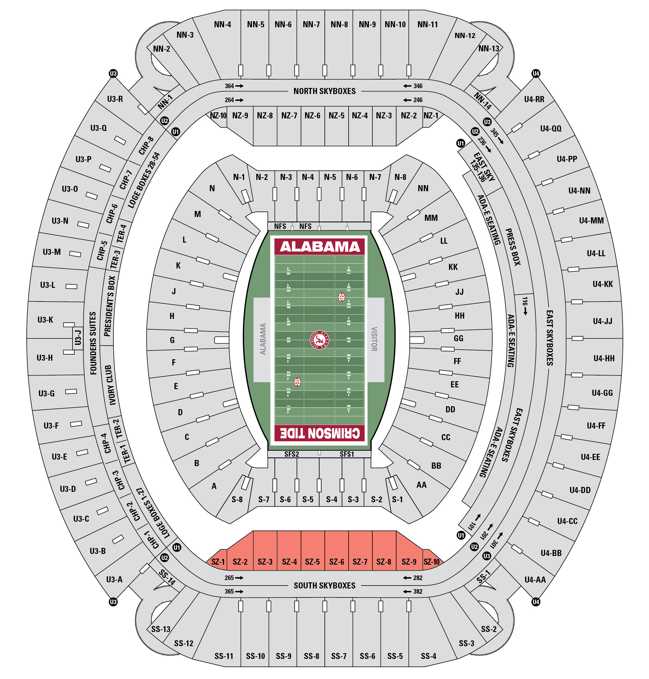 The South Zone is located on level 5 behind Saban Field at Bryant-Denny Stadium's south end zone.
